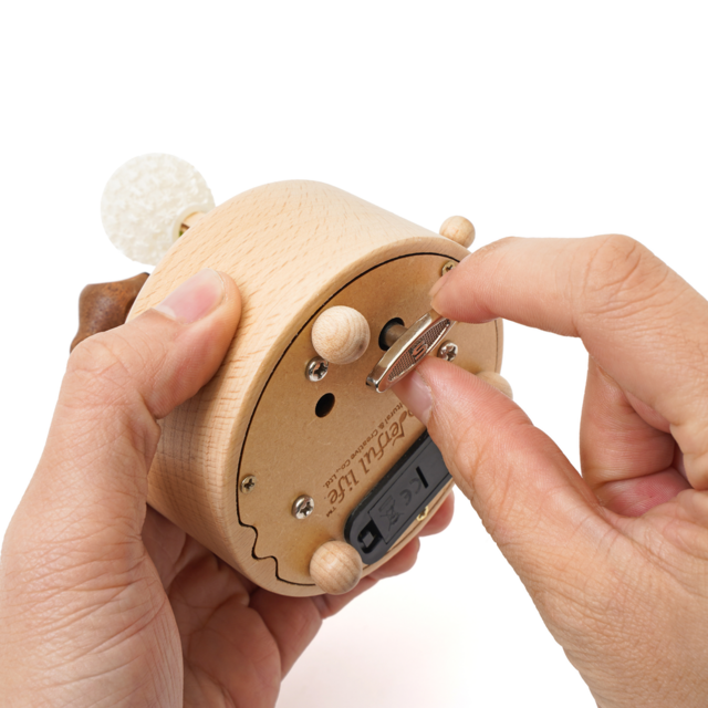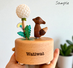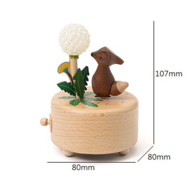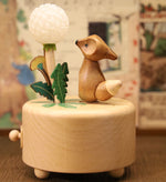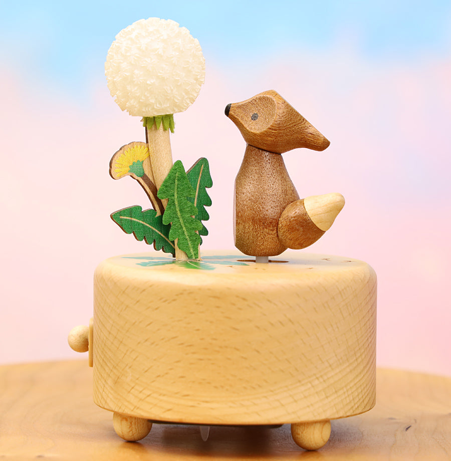 ♫ This cute music box shows a little fox praying to a glowing dandelion, making a warm and cozy feeling, especially at night. The soft light from the dandelion adds a magical touch that's hard to show in pictures. Made from maple wood, the music box plays "Cielito Lindo." Just wind up the base and use the switch on the side to enjoy the sweet melody. What do you think the fox is wishing for? Maybe a yummy birthday cake or lots of toys!